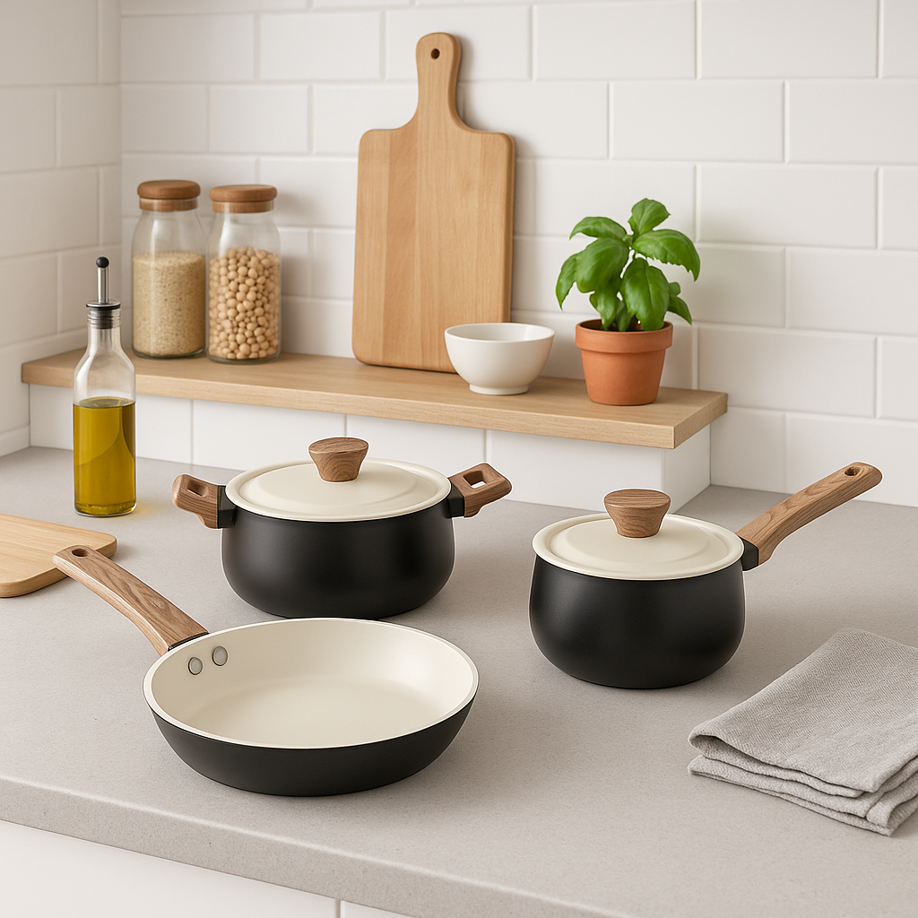 Сковороды с эргономичными термостойкими ручками обеспечивают надежный захват, снижая риск пролития жидкости и ожогов.